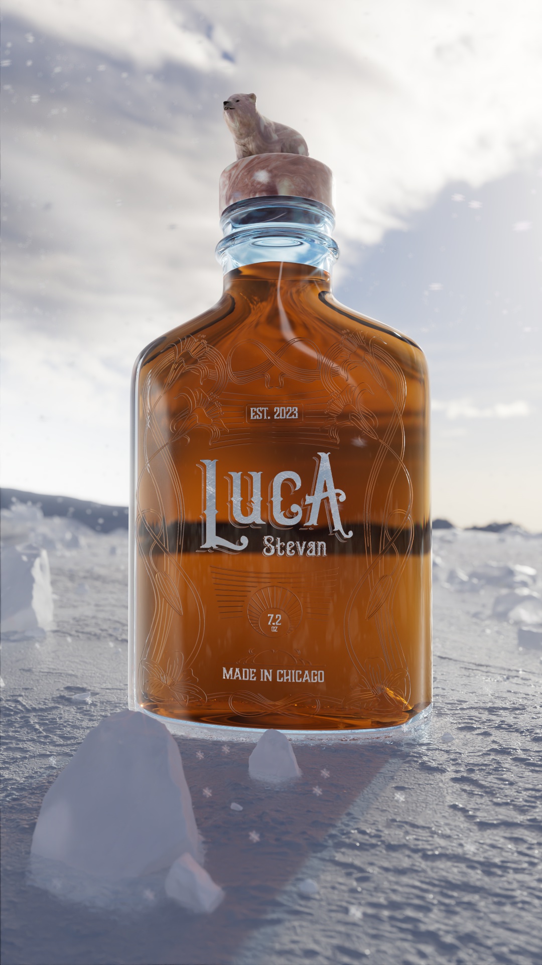 In honor of the birth of my son, instead of handing out cigars I had the idea of creating a custom flask for the announcement. Created in Cinema 4D with Redshift.