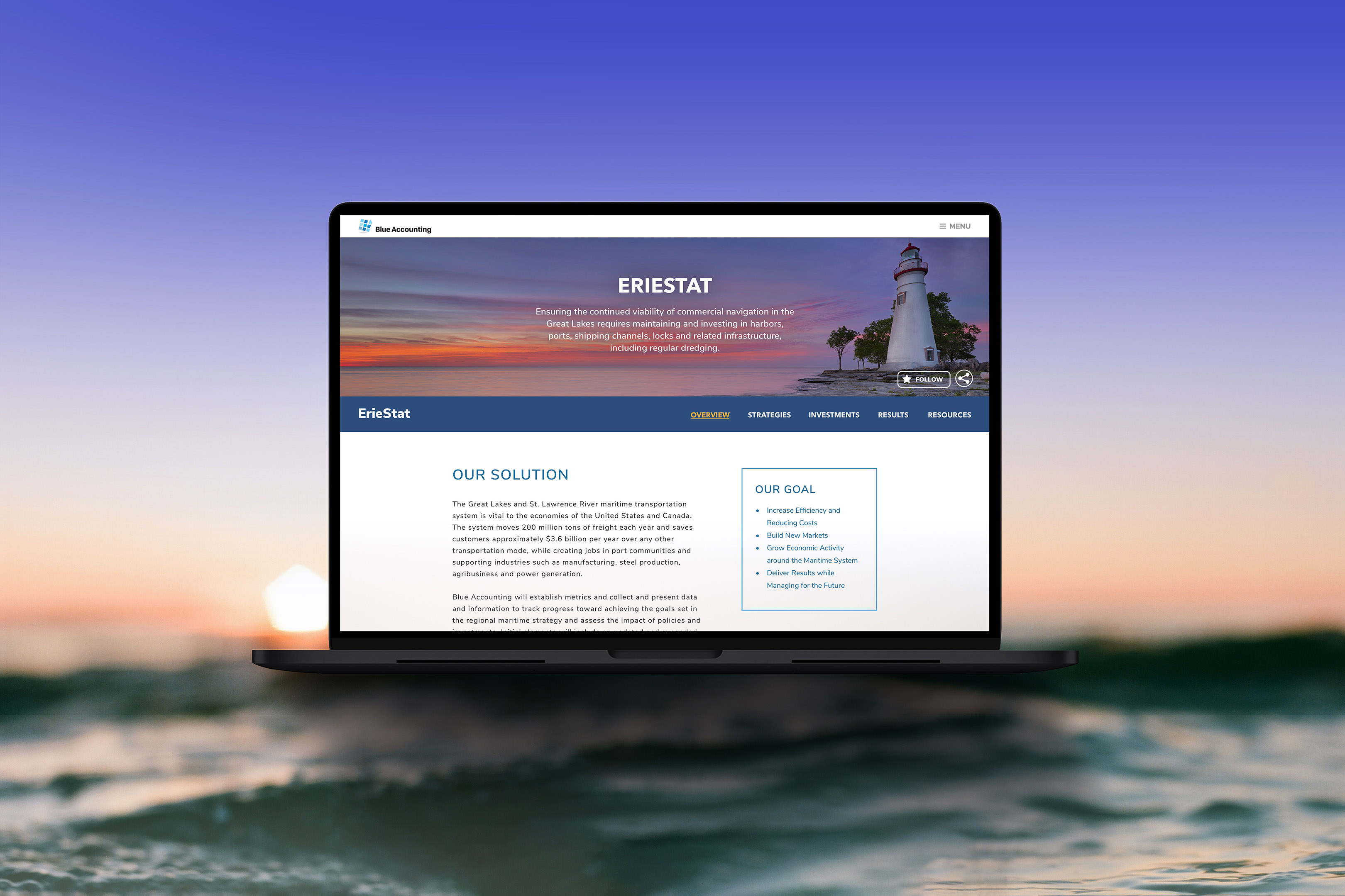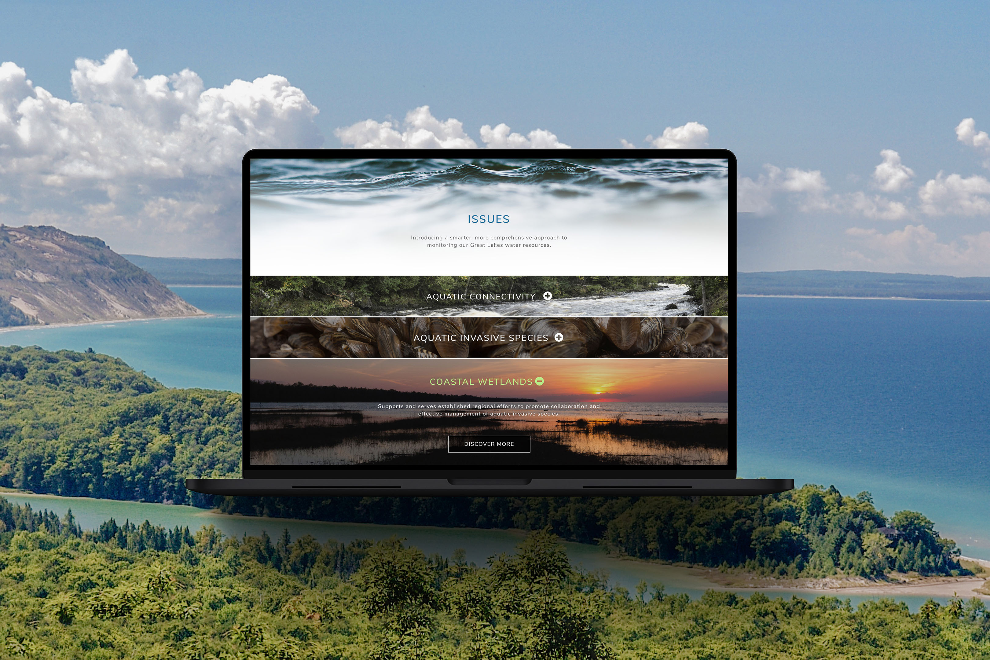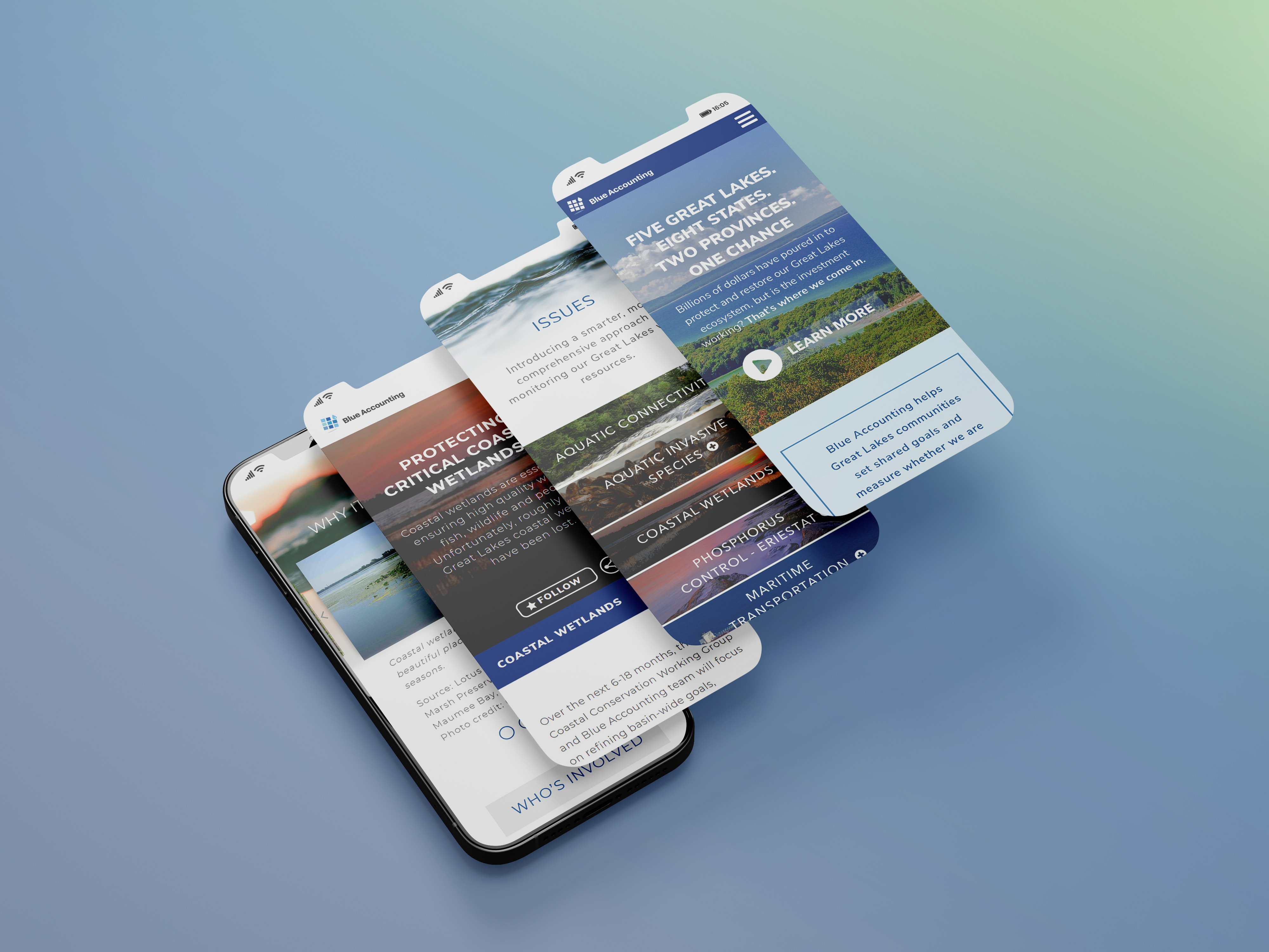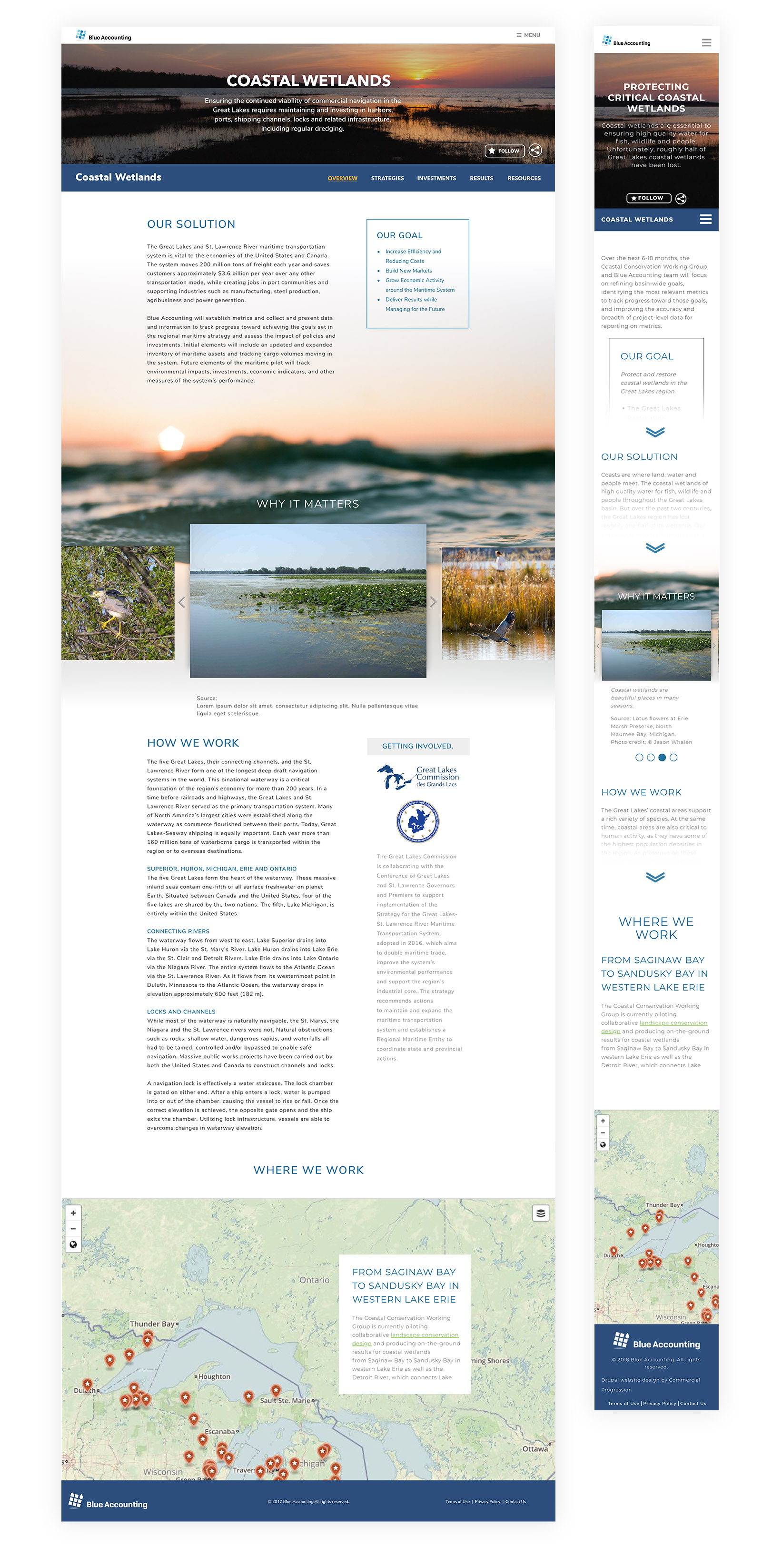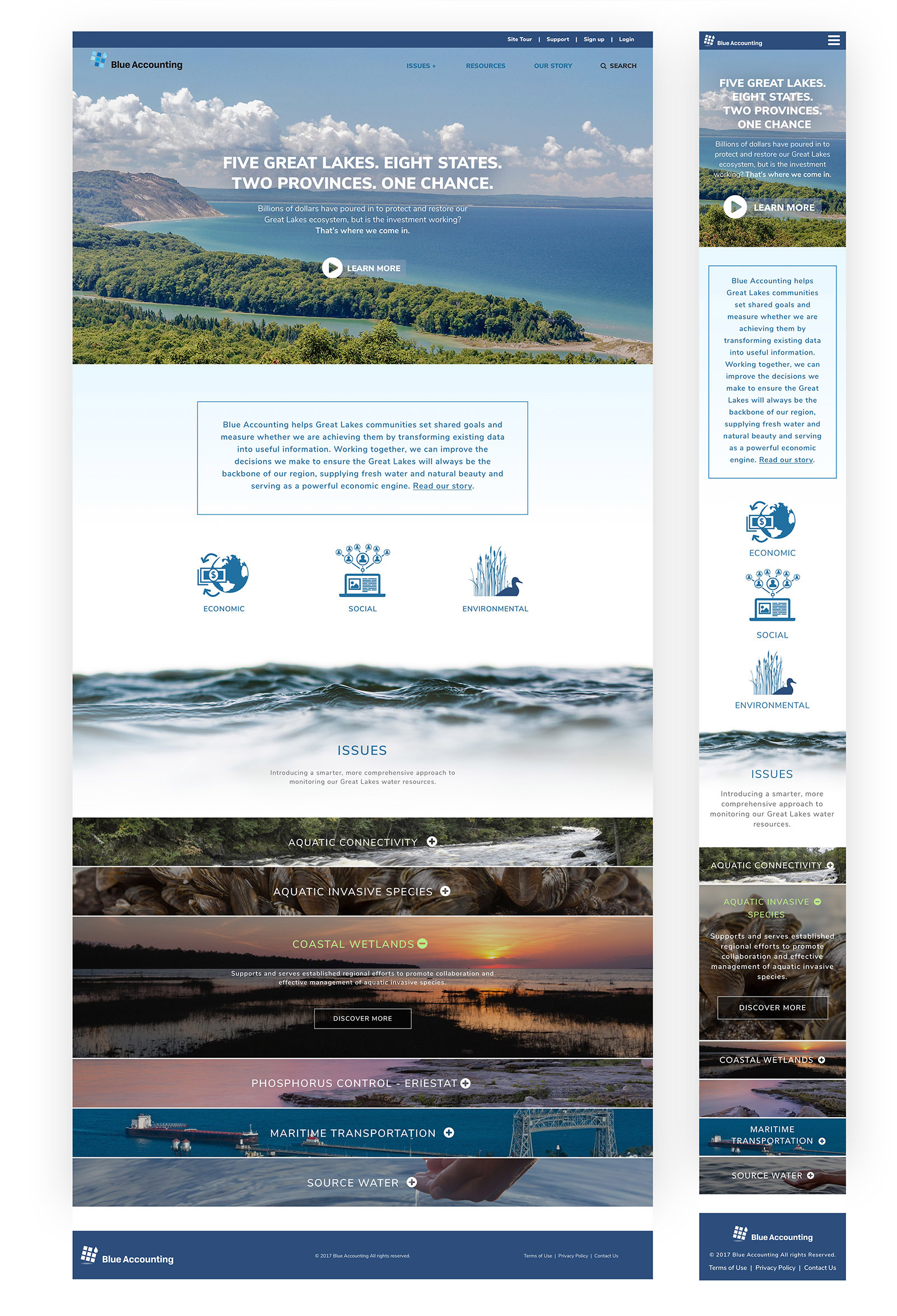 Website design for The Nature Conservancy & Blue Accounting partnership. The focus of the project was to further develop the relationship between sustainable business practices and protecting the Great Lakes. The website needed to highlight the environmental initiatives and knowledge base for the Great Lakes, which could be used for various scientific and commercial business purposes.